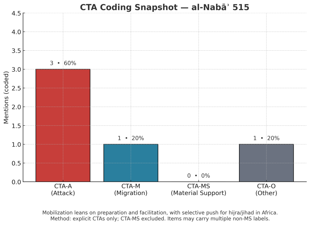 Al-Nabāʾ 515 is less about announcing dramatic breakthroughs than about maintaining momentum and broadening participation. The editorial transforms preparation into duty, keeping supporters in continuous “jihad” even off the battlefield. Africa supplies the kinetic “proofs” and the recruitment pitch; Syria and Iraq supply enduring grievances and repeatable tactics. The media layer—documented visuals and a durable enemy taxonomy—binds these pieces into a coherent, exportable script. For policy audiences, the take-home is clear: expect continued attempts to activate low-signature contributors globally while Africa remains the showcase. Monitoring should prioritize (a) facilitation signals keyed to hijra/jihad appeals in African theaters, (b) narrative uptake of the al-Hawl frame in the Euphrates basin, and (c) the use of “documented” visuals to launder small tactical actions into strategic messaging wins.