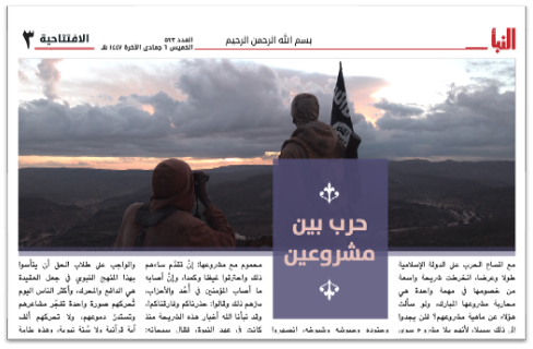 1. The lead editorial of issue 523 of the ISIS’s weekly Arabic newsletter al-Nabaʾ, which argues that only two meaningful “projects” exist in the world: ISIS’s project of fighting ṭāghūt (idolatrous, tyrannical rule) everywhere, and a rival project that defends ṭāghūt under various banners. The text expands the enemy camp to include not only states and “original disbelievers” but also former sympathizers, rival jihadist factions and reformist Islamists, depicting them as people who “believed and then disbelieved” and now collaborate—overtly or implicitly—with hostile powers. The binary is used to erase any legitimate “grey zone,” recast defections and criticism as a form of apostasy, and present continued loyalty to ISIS as the only valid option. ↩︎